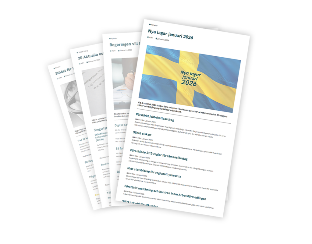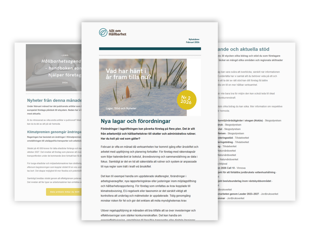 Varje månad skickar vi ut ett sammanställt mejl där det nödvändigaste är inkluderat. Här får du tillgång till nya lagar, aktuella stödprogram och nyheter som är mest relevant den månaden.